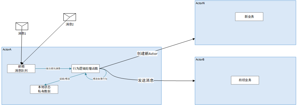 - 行为逻辑:这是 Actor 的“大脑”。它从邮箱中一次取出一个消息进行处理。这种单线程处理方式天然避免了锁的竞争。