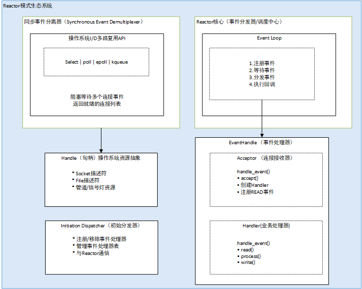 - Reactor:事件分发中心,负责监听和分发事件。